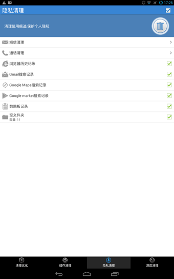 Android上第一款深度清理软件,真正清理SD卡,缓存,垃圾短信,垃圾文件,全部清光光!新版一键清理重新布局,加入了历史记录清理,增加深度清理提示,防止误操作。拥有更方便的操作,更好的用户体验。