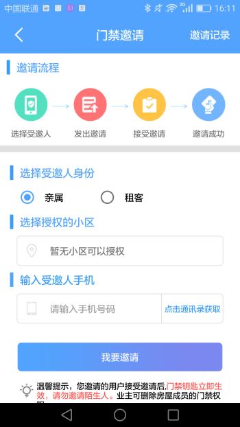 3.业主可以邀请租客、亲属:只有业主才可以有权限通过输入手机号码的方式邀请租客或者亲属开门。