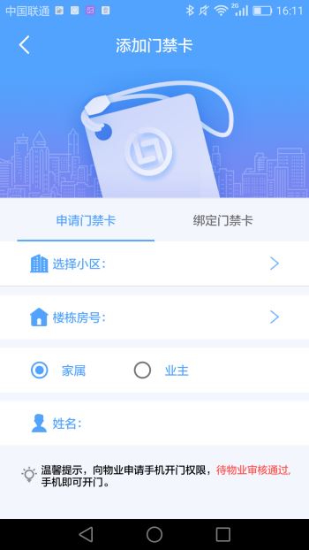1、门禁卡需要申请,需要通过物业审核通过才能获得;