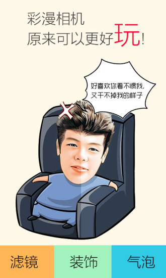 彩漫相机app是全球第一款彩色漫画相机重磅来袭,海量免费背景,N多美妆效果。想要自己的Q版卡通形象?想让心情时刻缤纷美丽?想将生活过得个性百变?彩漫相机为你轻松解决:随手一拍,属于你的个性彩漫立刻呈现。龙王三太子哪吒,独臂大侠杨过,内裤外穿超人,超级英雄蝙蝠侠,更有各种白富美、俏佳人、女汉纸、蛇精病造型等你来玩转,脸型、发型、配饰 百种选择,让你想怎么换就怎么换!个性化时代,自定义精彩!