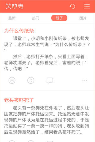 笑林寺APP是一款为大家提供各种让你捧腹内容的app软件,这里有各类搞笑的内涵段子,不求你笑死,只求你笑累,分为最搞笑,内涵图,荤段子,冷笑话,成人漫画,糗大了,猛笑料,有点色,恶搞囧图九大版块,天下笑话出少林,喜欢看笑话的朋友不要错过哟。来了,不求让你出家剃度,每日让你按时捧腹。无论是莽汉还是怨女,熊孩子还是学霸,老妖精还是人参娃,想笑就来!寺门常开!最后请许主持吐个槽:独乐乐不如众乐乐,施主请快分享吧