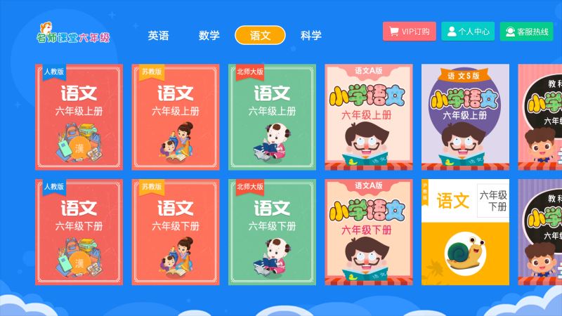 小学六年级同步课堂:语文、数学、英语、科学上下册跟教材完全同步的辅导课程。 涵盖了全国各个版本:人教版、部编版、北师大版、苏教版、外研版、粤教版、沪教版、上外版、北京版、浙教版、鲁教版、冀教版、川教版、湘教版、教科版、西师大版、粤人版、科普版、科粤版、辽宁师大版、青岛版、鲁科版、湘少版、苏科版、新起点、PEP、精通版。