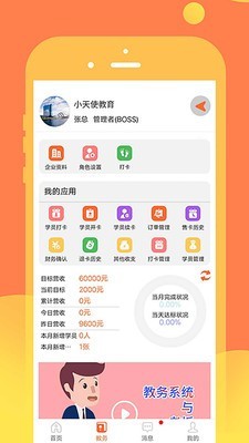 机构:显示家长已加入的机构,家长可以查看某一机构的具体信息,如机构相册、机构新闻、机构师资、机构地址等,还能进行学员打卡,查询日程,查看学员档案和相关订单等操作;