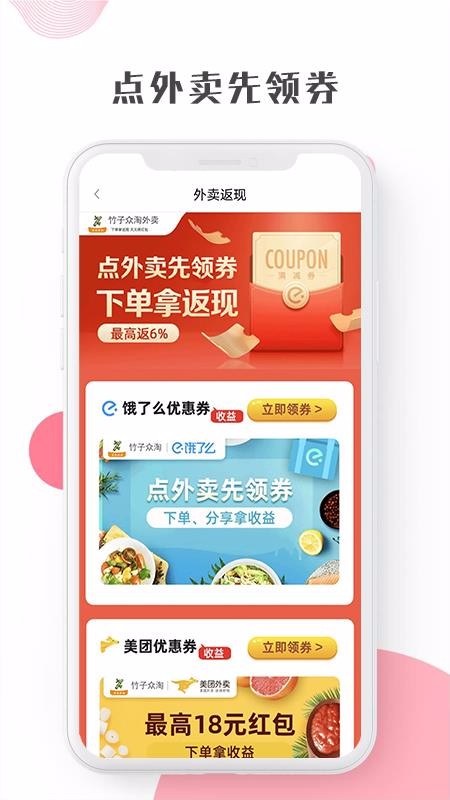 竹子众淘app是帮助您以后购物省钱的小帮手,这是一个最新的网购省钱神器,可以帮助用户找到各大电商平台提供的优惠券,您以后就能进行优惠券下单,让您购物省钱更便捷;用户以后在淘宝、京东、天猫等平台进行购物的时候,都可以在竹子众淘手机版中搜索优惠券,这样可以帮助您提前找到优惠券,购物的时候就不会错过更多的优惠,以后网购可以花更少的钱;有很多的功能服务,可以随时来下单,还有同城的外卖提供哦,免费折扣券领取,轻松在线买,非常省钱的一个购物平台,每天都有丰富的商品上架,可以随时来挑选,购物很方便,精选折扣,每天好货不断,可以买到你需要的商品,超低的价格,想买就能买。