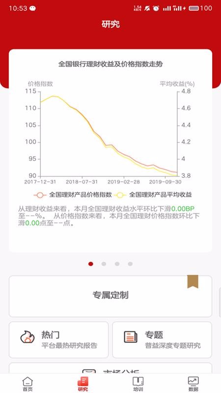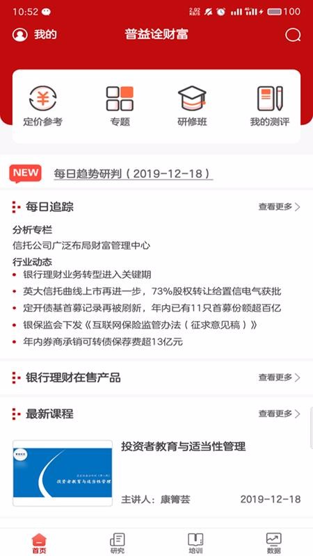 普益诠财富app非常好用的以财富管理行业的用户为服务对象的金融资讯软件,提供全国UI农行理财收益及价格走势分析图,帮助每一位用户解决投资问题;并且提供了专门的投资课程,学习投资知识,掌握投资技巧,学会投资趋势预判,精准打造低风险的投资方案,让您更好的进行银行理财;通过报名研修班系统学习,多方面满足投资用户所需,帮助您轻松投资;软件有海量的金融理财信息,实时动态,还有很多金融理财产品信息,满足用户的需求,为投资者提供一站式专业的咨询服务。欢迎下载使用。