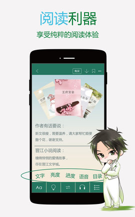 【超大书架】多种本地图书导入方式,书架含图书排序、分类等多种贴心功能。【海量书库】30 万册图书书城,包括了各种精品出版物与网络原创小说。【新增漫画】热门、经典漫画一应俱全,二次元的你快来体验吧!【手指笔记】以「指」代笔,随时摘取精彩内容,真正实现读书不忘!【离线阅读】跨终端数据同步,享受高速流畅的离线阅读体验。【个性排版】自定义阅读界面排版。【免费图书】每日为读书人提供各种不同的免费正版图书,包括免费原创小说及精品出版物。【追书提醒】提供小说追书提醒,时间看更新。【书荒书单】各种书单,方便读书人书荒找书【晋江小说阅读vip版 软件亮点】