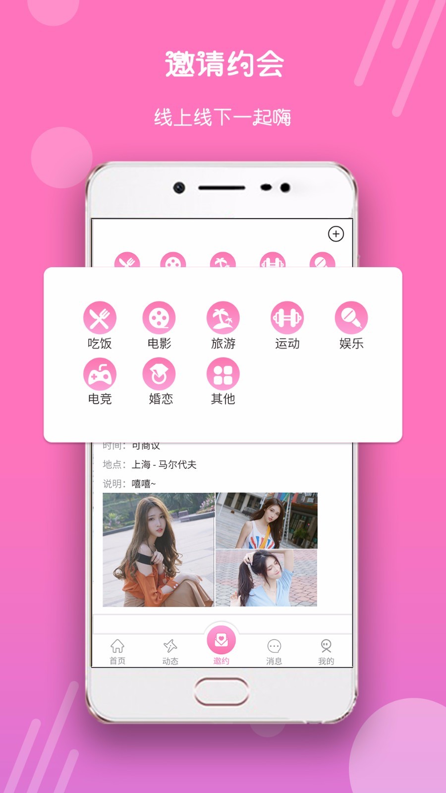 3、遇见喜欢的用户,可以直接邀约,线上线下都可以,吃饭、看电影、运动、旅游、游戏等随你选