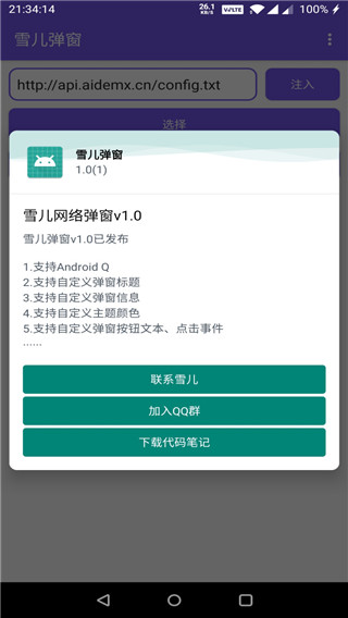 雪儿弹窗app是一款小巧精致功能强大的实用工具软件,支持自定义弹窗模式和字体颜色,可对弹窗信息和图标颜色进行修改,可用于为其他app注入远程更新、远程公告等用途,雪儿弹窗软件是采用读取配置文件的方式来实现弹窗的自定义功能。配置文档可在工具的菜单->配置文档里复制,将配置文档粘贴到服务器或其他第三方平台并复制其链接到本工具中即可开始注入。雪儿弹窗app支持自定义弹窗模式和字体颜色,可对弹窗信息和图标颜色进行修改,简单好操作,实用又安全。有兴趣的朋友可以下载雪儿弹窗软件体验哦。