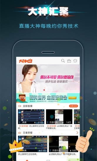 =大神TV已进入全民时薪时代,只要你来直播就有钱,不用羡慕别人边玩游戏边赚钱,下载大神TV让你的手机成为你的直播台,来大神直播挖取你人生的第N桶金子!你!不只是看客。