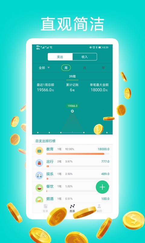1、图表账单展示,趋势图显示日均花费,饼状图分析收支构成
