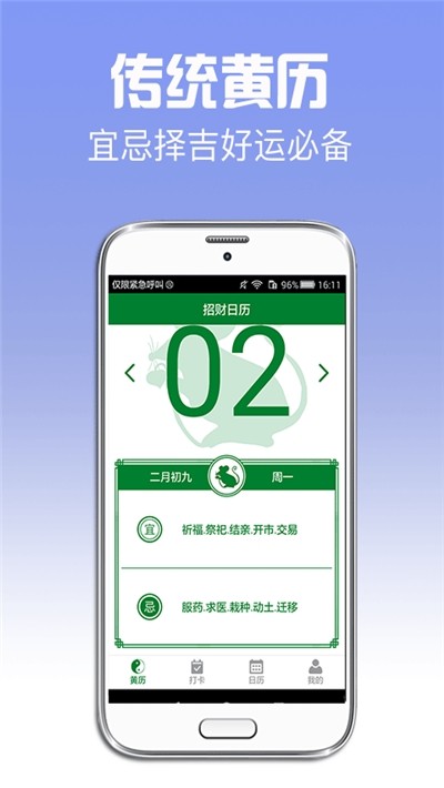 提供日历黄历、宜忌吉凶、节日提醒、干支节气等信息,还有早起早睡打卡、眼操定时提醒功能,让健康与您每日相伴。