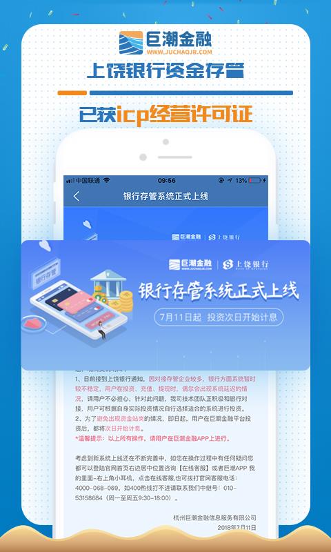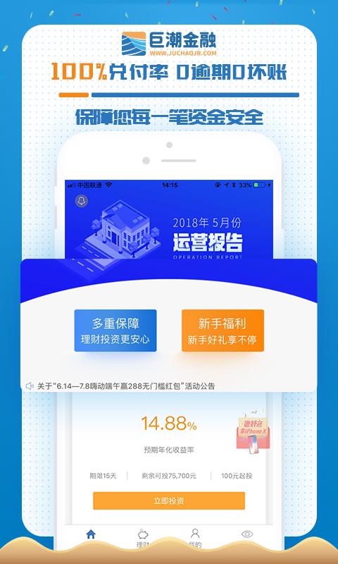 巨潮金融理财投资app是一款为客户提供在线投资、在应用中为客户提供了来源真实的项目资源,让客户轻松掌握对应的项目投资;在应用中为客户提供第三方担保机构,帮助担保,保证了出借投资人的合法利益。提供可靠的消息分析的应用,让你可以轻松的在线进行对应的理财投资服务,让客户可以轻松的在线进行理财;为客户推荐了大量的在线投资项目,让客户可以轻松的进行投资,帮助客户更好的投资,在应用中为客户提供优质的风险控制团队,让客户轻松控制风险,
