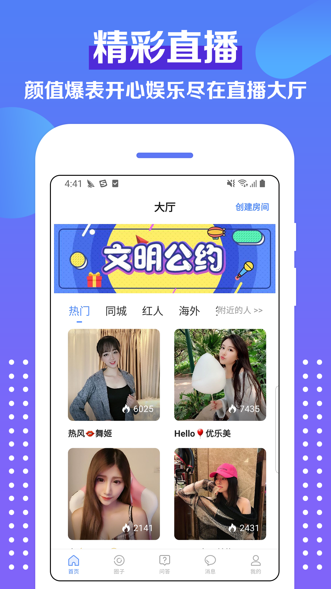 Usee是一款集聊天与直播为一体的社交软件,旨在利用直播与聊天服务让你观看到精彩的直播节目、认识优秀的新朋友;软件提供直播服务,在这里有大量主播正在直播表演个人才艺,你不仅可以观看到精彩的舞蹈表演,还可以欣赏到优美的歌声,当然还有各种户外、游戏等直播内容等你来看,相信丰富的直播内容一定可以让你满意;软件提供聊天服务,在这里有众多用户正在寻找聊天对象,当你通过圈子动态或是问答找到感兴趣的用户时可以发送消息与对方聊天,只有积极的找人聊天才能不断认识新朋友;为净化环境Usee安卓版推出举报功能,当你遇到不文明的动态时可以直接举报对方,一旦官方工作人员审核属实就会对动态发布者进行处理。