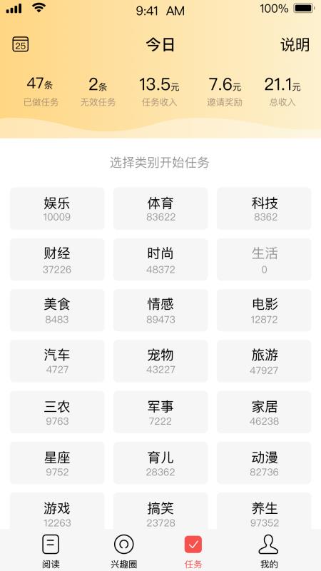 推推互动阅读APP是兴趣推荐阅读平台,拥有海量优质的阅读资源,这里拥有丰富的资讯资源能够全方位满足不同喜好用户群体的阅读需要,保证可以让所有用户都阅读到自己喜欢的资讯;软件推出娱乐、体育、科技、财经、时尚、生活、美食、情感、电影、汽车、宠物、旅游、三农、军事、家居、星座、育儿、动漫、游戏、搞笑等多个资讯频道,让自己的收益看得见,赚钱更有动力,这里提供了丰富的任务,用户自己来选择任务完成,只要完成任务就能得到不菲的收益,每天利用闲暇时间就能为自己站零花钱,妈妈再也不用担心我没零花钱啦,时间自由无限制,什么时候都可以参与,让你轻松创造人生的第一桶金。
