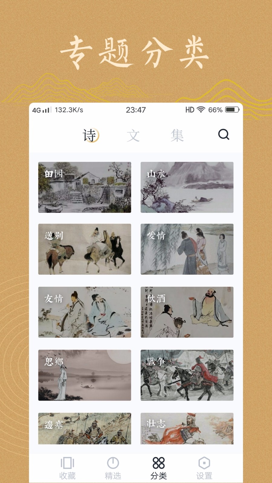 3、分类精细:不论是诗文还是书籍,都从各个维度进行全面的分类,让你能更快找到想要的内容。