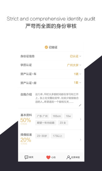 3、我的:个人详细信息的真实,会员信息都是经过严格的审核,可以在第一时间最真实的了解会员的个人情况。