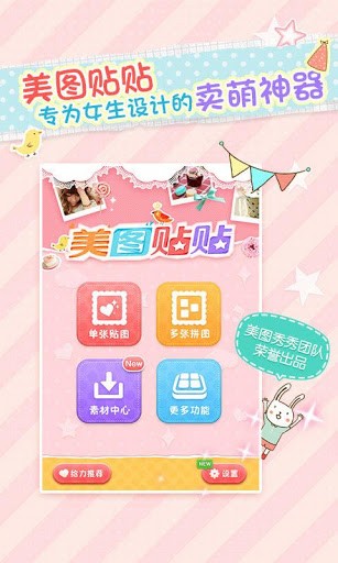 美图贴贴是一款专为女生设计的大头贴软件。一分钟DIY个性大头贴,多图随心拼贴,打造你的可爱照片墙~内置上百种精心设计素材,让你轻松的将照片装饰的更加可爱、有趣。美图贴贴app是一款非常好用的手机p图软件,这款手机贴纸APP内置了丰富的贴纸效果,支持单张、多张贴纸编辑效果!爱玩自拍的网友们可以使用它快速美颜哦!支持朋友圈、微博等平台分享操作,喜欢的朋友快来下载吧!