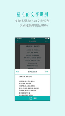 扫描王APP是当前办公人士都在使用的文字扫描工具,APP拥有最为先进的文字扫描技术,支持多语言的文字识别,可以快速的为您识别图片中的文字内容,然后将文字内容直接提取出来,这样您就可以更好的对文字进行编辑了,提高了您的工作效率,节省了许多繁琐的步骤;用户还可以使用APP对文件进行分类保存,提供实用的云同步功能,实时的同步文件信息,您可以随时随地的下载和上传文件,让您的办公更省力;需要的用户赶快来下载使用吧!