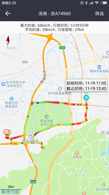 行驶轨迹查询:支持查看车辆运行轨迹,最大时速、平均时速、行驶里程、行驶耗时、停留时间等。