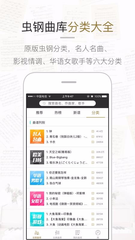 如果你热爱弹琴,下载虫虫钢琴APP,去探索各种专属于你的钢琴谱;如果你擅长制谱,下载虫虫钢琴APP,把琴谱传播给更多热爱音乐的人。虫虫钢琴网作为运营超过十年的钢琴谱分享网站,集合了众多音乐爱好者、高水准曲谱制作人和海量的各类钢琴曲谱,是你寻找钢琴谱、传播钢琴谱的不二选择。虫虫钢琴APP是虫虫钢琴网官方APP,我们立志打造最棒的曲谱交流圈。在这里,可以下载并分享高清优质五线谱、畅听稀缺的钢琴曲集,还有更多好玩实用的功能等你来发现。