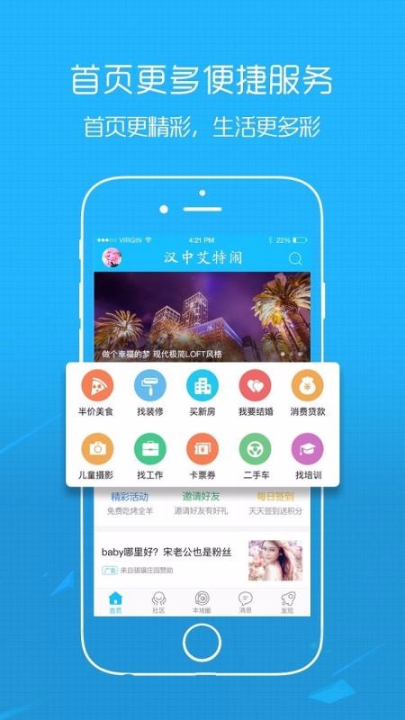 汉中艾特闹app为用户提供全方位的本地服务,这里能为你提供汉中好吃好喝、好玩、聚会活动的地方,还有本地的热点时事新闻,旨在为汉中本地用户带来最便捷的城市生活服务。有着清晰详细的分类版块,便捷寻找你需要的本地服务,通过线上预约的方式寻找满足需求的本地服务项目,为您带来更多生活精彩;汉中艾特闹手机版还拥有同城圈子社交功能,丰富全面的本地社交圈,实用的生活技能、本地的特色美食、好玩的旅游景点等内容都可以通过参加圈子互动的方式了解到,让您做一个智慧的本地人,可以在平台上一键搜索就能够找到你想要的,同时还能够在平台上找工作、租房等,有需要的话就来下载试试吧!