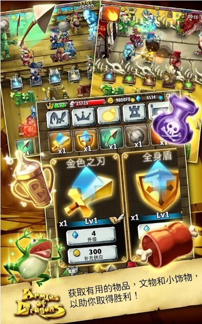 2、通过战斗赢得水晶,解锁宝藏和强大的英雄! 获取有用的物品、工艺品和小饰物来帮你赢得胜利