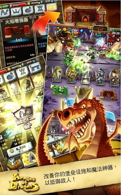 3、升级堡垒并解锁不同类型的守卫,例如树人、魔像和巨龙,闯过12个残酷的关卡,每关有8级