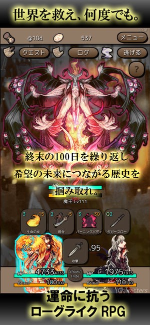 拥有无限循环机制的回合制冒险游戏,游戏设定非常有意思,进入游戏有个100天的倒计时,玩家需要在这100天中不断强化自己,通过升级、加点、强化武器等等方式增强自己的能力,然后去挑战大魔王,如果挑战成功那么你就获胜,如果挑战失败,游戏就会又回到100天之前,如此循环,但是你所走的路线却是根据你自己的选择进行,每一次冒险都是不一样的,你的终极目的就是打败大魔王!