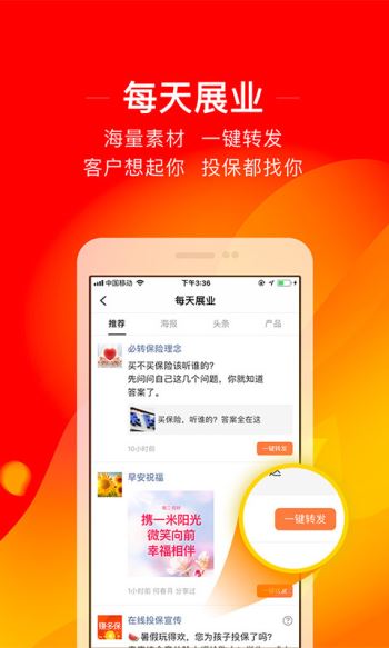 将喜欢的展业素材分享到朋友圈,转发给各位客户