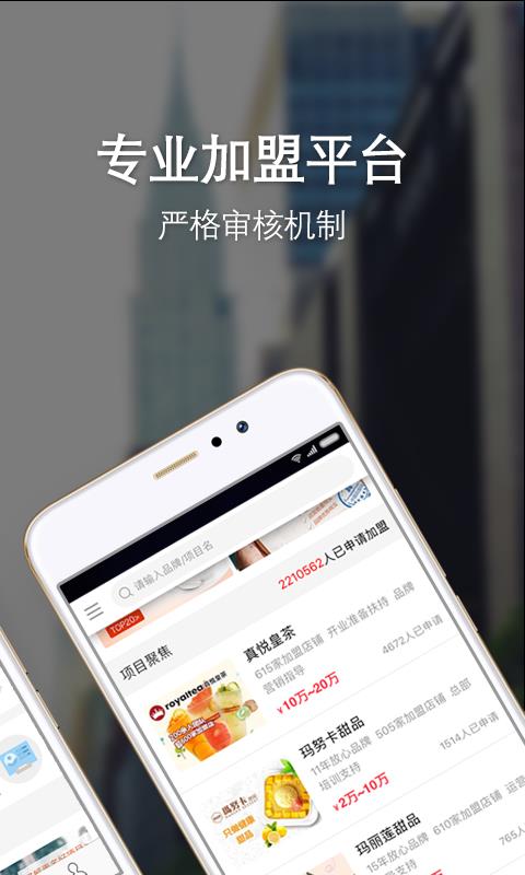 中国加盟网是一款为创业者量身打造的创业找项目软件,覆盖餐饮加盟、教育加盟、服装加盟、美容加盟、幼儿加盟等18大类行业垂直招商加盟,提供当前最热门加盟项目、创业资讯指导、创业经验分享、品牌加盟动态咨询等内容,让您全面及时了解项目信息,覆盖全国各地加盟信息,帮您找到身边最合适您的加盟项目。全部项目皆有专业的创业专家核实确认,保证项目真实性,大大降低您的创业风险。 中国加盟网汇聚数万家优质品牌项目,并且操作简单,让您创作更轻松,创业加盟找项目就用中国加盟网!