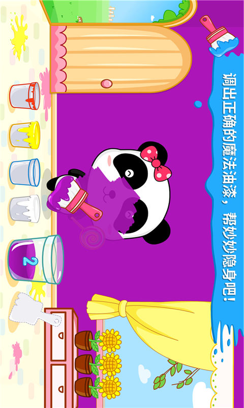 房间1——魔法油漆:将不同颜色的油漆混在一起,调出正确的颜色刷在熊猫妙妙的身上,妙妙就可以像变色龙一样隐身啦!