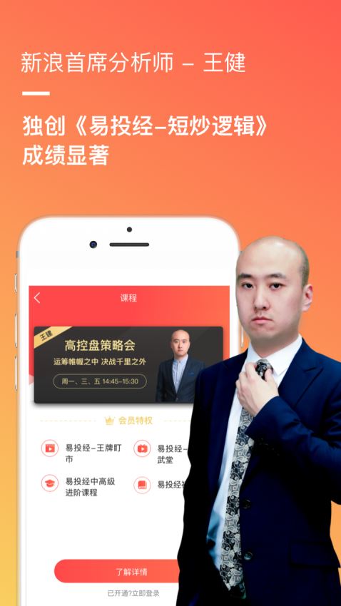 1. 跟名师操盘:曾任职于东方财富等多家知名机构的王健老师,根据多年股市实战经验《易投经》短炒逻辑,教学风格风趣易懂,深受广大投资者好评,2017年-2018年连续荣登纽约时代广场纳斯达克大屏 2. 选潜力好股:结合新浪AI和大数据技术,提供智能诊股、股票走势预测、云图看盘等盯盘工具,助您拨清选股魔障,让投资之路更顺畅。 3. 追全天热点:金融研究所汇聚研究团队,每日替您寻找市场上高含金量的研报信息,深度分析提供:投资宝典、热点挖掘、T MD内参、深度复盘等专业内容,满足您不同时段的需求。 4. 看直播互动:和亿万股民互动交流,更有行业大佬盘中实时传授炒股经验,实战加教学,手把手练就属于你自己的交易体系。 5. 服务专区:vip服务全新大升级,集合直播预告、俱乐部实时动态、市场直击报告及更多vip服务于一体,给您更快的服务体验。 6. 尊享会员plus:会员plus功能提供6大超值权益,每月上新会员专属报告、视频、活动、礼物等,快来开启您的尊享体验。