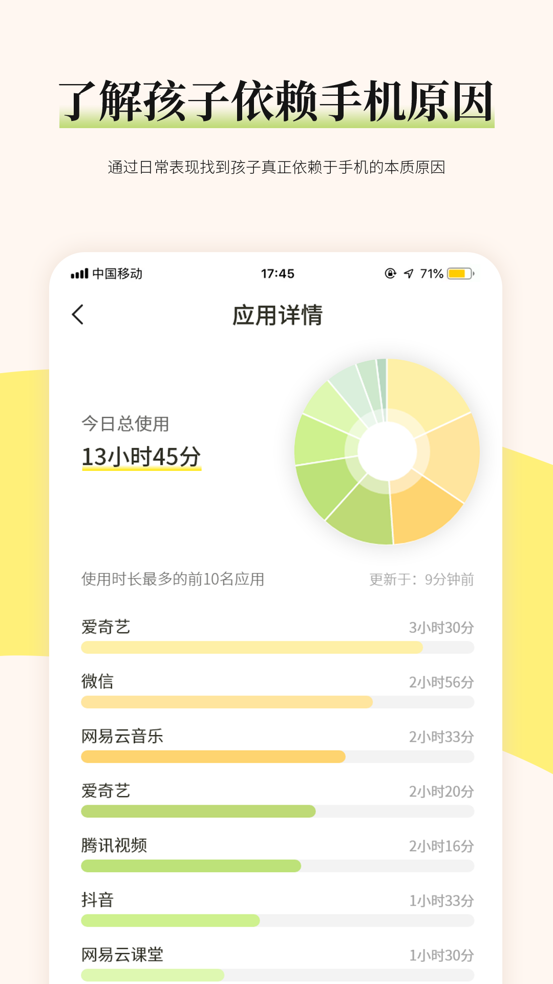 3、让孩子们拥有合理的学习时间观念,智能的系统还可以详细的分析孩子们玩手机情况的数据,帮助孩子们养成更好的学习习惯,