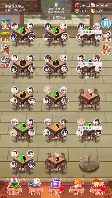 2、宣传可在一段时间内增加火锅店的客流量,游戏中共有6种宣传模式,每个模式的获客成本都不同;