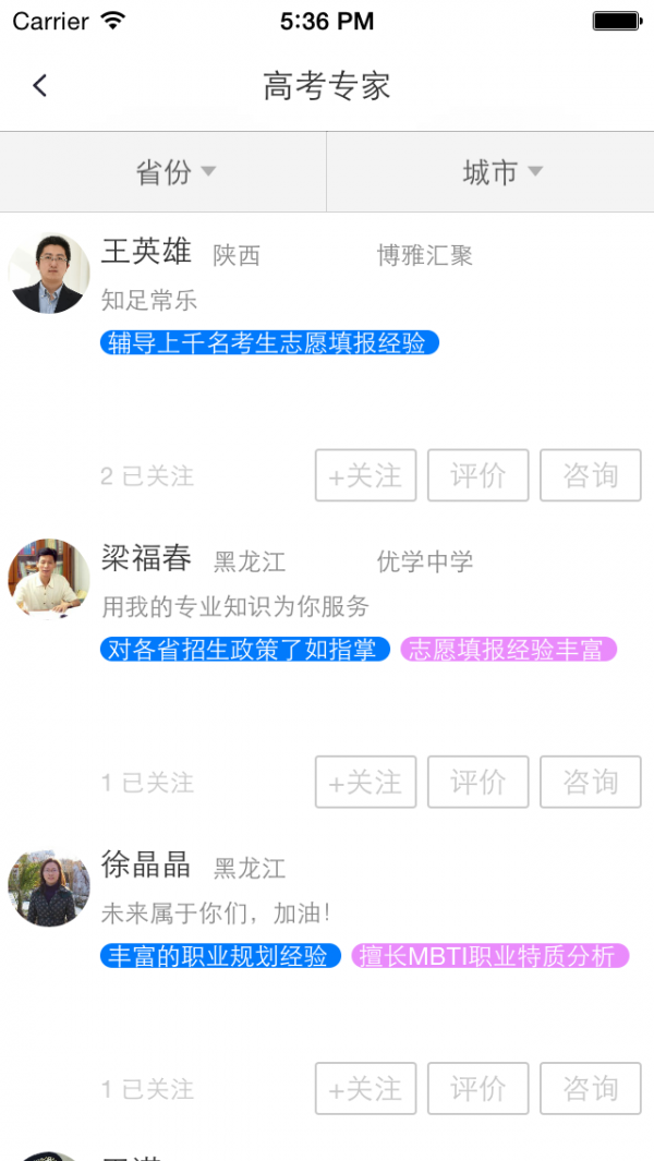 4、专业:数百名经过筛选、认证、培训的高考报考专家、职场大咖、名校学长学姐为高中生在线答疑,深度辅导