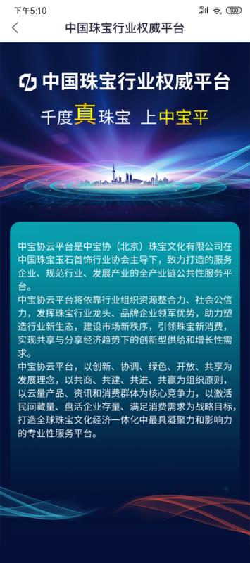 中宝平app是专门为“高端意见领袖”定制的集杂志、报纸、电台、电视台于一体的APP产品,司马平邦的独家的深度观点、及时全面的信息资讯、真实的粉丝互动、 专属的独立王国。可以在app内购买大品牌出售的珠宝商品,足不出户就可以购买的优质的珠宝商品;同时我们还提供了市场指导价格,便捷的查看各种品质的珠宝价格走势,帮助用户用低价购买最优质的珠宝商品;社会公信力,发挥珠宝行业龙头、品牌企业领军优势,助力塑造行业新生态,建设市场新秩序,引领珠宝新消费,实现共享与分享经济趋势下的创新型供给和增长性需求。当您购买珠宝商品过后,还能够通过便捷的通道查看珠宝商品的身份,知道珠宝商品的来源,查询其真实性,欢迎喜欢的朋友下载软件使用。