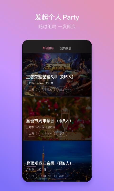 4、支持在线发起聚会活动,报名参加他人举办的聚会;