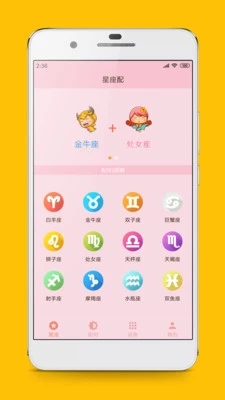 星座配app是一款功能相当丰富的星座运势查询软件,为用户提供了12星座的解析配对以及运势查询等内容。星座配app让你知道两个星座人之间的处事情况,为你处理各项关系提供参考,感兴趣的朋友赶紧下载吧。星座配app是一款星座预测类的软件,专门对预测星座设计,多种不同的功能,针对12星座进行详细的分析解答,囊括了多个不同的运势,帮助你的解决生活的难题,赶快下载吧!
