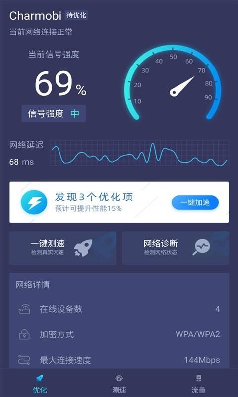 WiFi性能测试是一款针对WiFi专门设计的检测优化app,当自己连接WiFi上网的时候遇到网络卡顿则可以使用这个app,因为这个WiFi检测优化app手机版可以自动的检测WiFi信号强弱、网络是否延迟以及网络是否正常等,如果想要知道当前网速的话也是可以测试的,非常的好用。同时,在WiFi优化方面,当自己感到网速变慢了的时候可以在这里一键优化WiFi,从而在短时间提升网络的速度,自己也能更好的体验畅快上网的感觉,如果觉得这个应用相当不错的话不妨下载到手机亲自尝试操作。