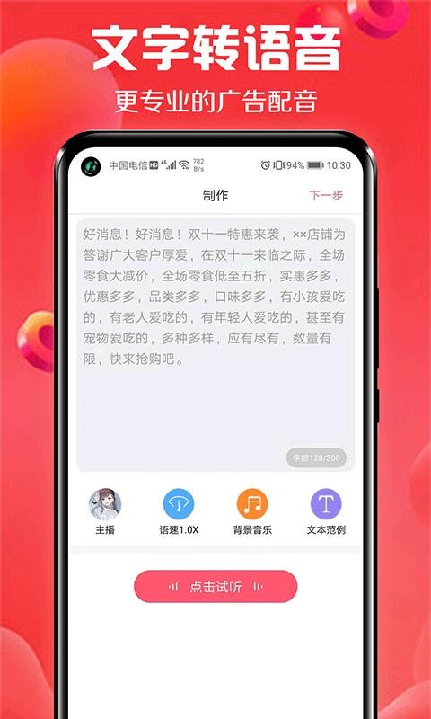 免费广告配音是一款文字转语音app,主要用于为广告配音,当小摊摊需要叫卖声、电子书需要朗读以及解说需要配音、广告需要宣传等情况下可以在此进行文字转语音,因为这个文字转语音app手机版有着丰富的广告模板,每个人可以自选模板而开始自作广告的配音,配音的内容可以自己编辑,可以先编辑文字再转换为语音,并且,专为语音的时候可以自选智能主播的音色,从而拥有专业级别的配音效果,非常的好用。同时,在此制作好的广告配音可以直接导出其音频,能够以MP3的格式进行导出。