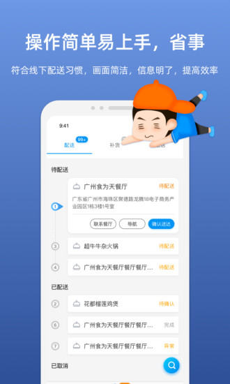 3、操作简单易上手,省事符合线下配送习惯,画面简洁,信息明了,提高效率;