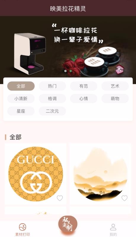 映美拉花精灵app是专门为映美拉花打印机研发的一款商用打印工具,可直接将想要打印的图片上传到平台,手动编辑打印图片;系统有为大家提供丰富的素材,直接使用,将其添加到图片当中,让图片更加美观;并且在寻找图片素材的时候,直接通过素材的分类类目即可快速寻找需要的素材,通过简单操作就可以将电子图片打印出来;能够快速连接打印机设备,并且能够在线维护打印机设备,让打印机设备正常运行,更好的使用打印机设备,灵活使用设备将图片打印出来。