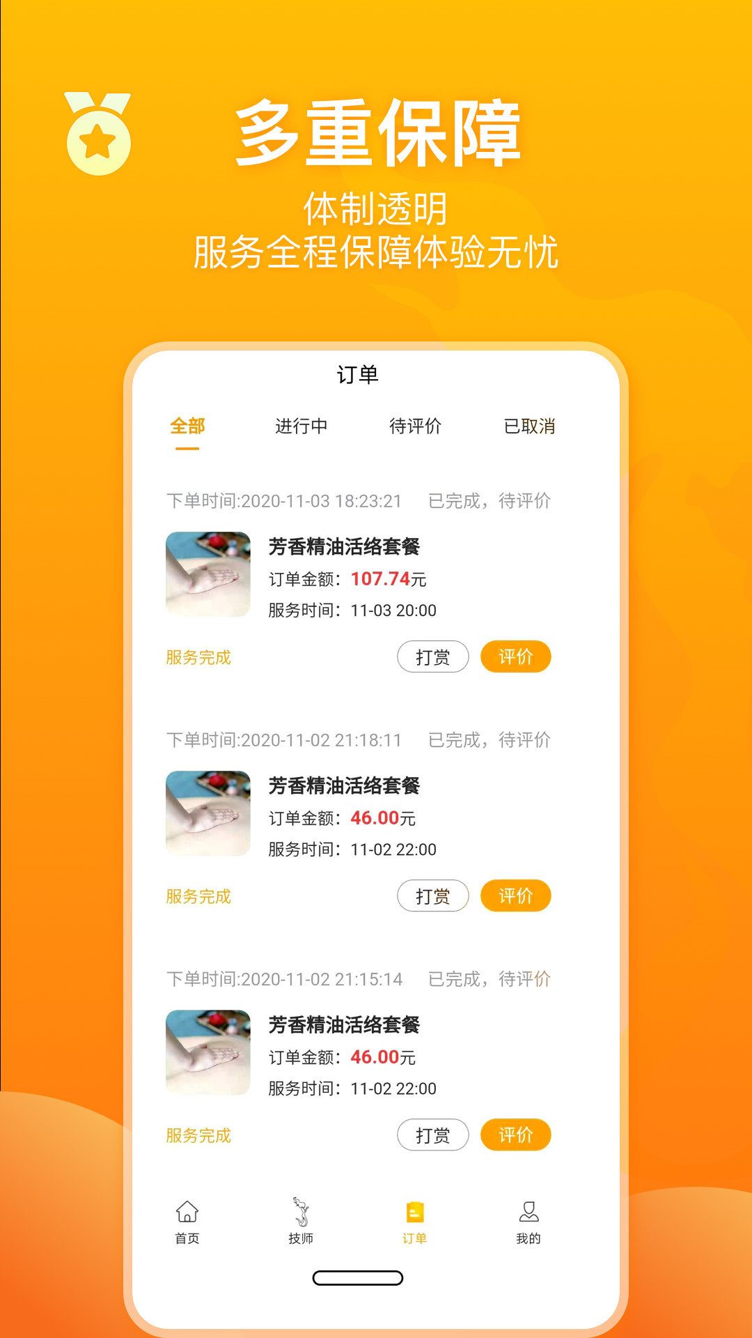 4、专业技师:严选经验技师,入驻平台根据距离、单量、评分等排序为用户提供按摩服务