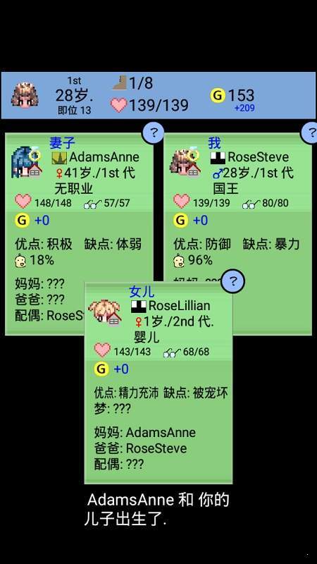 当然游戏本身并不是毫无意义地生孩子,也还是需要注意一下自己的配偶以及孩子等人的心理需求的,毕竟即使是亲生的孩子也可能因为嫌弃家里的房子太小而离家出走,或者你的配偶也会因为觉得自己受到了不公平的待遇,然后给你带有颜色的帽子!!!也因此,玩家在进行游戏的过程中不能只考虑到配偶的生育能力,一味地与人生孩子,还需要对下一代进行合理的教养,确保自己打下的江山在老了之后还愿意有人接手,而对方也有能力接手!