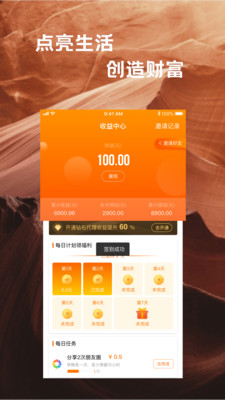 【收益】在这里您可以通过完成我们平台的任务,邀请好友来获得一定的收益,支持百分百快速提现!