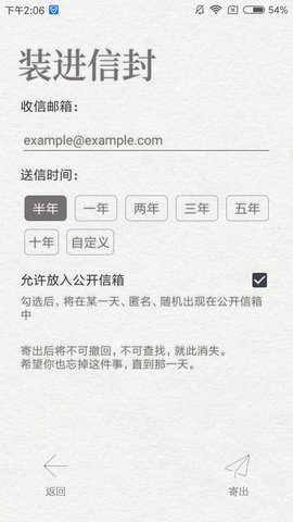 给未来写封信,给自己一个思考的机会,卯足那股情怀劲,给未来的自己,亦或热恋对象、某前任对象、父母子女等任何你想关心的人,用心写一封信。App 首页的公开信箱中,还有 4572 封(截稿时数量)掺和着酸甜苦辣咸的公开情怀信件。晚上失眠的时候,看看他人的情怀,说不定还会是一针强心剂。开发者的想法很简单,就是希望你忘掉这件事,直到那一天。在 App 首页的公开信箱中,还能看到其他用户寄出去的允许放入公开信箱的信件。通过「窥探」他人的信件,也许你会收到意外的「惊喜」。