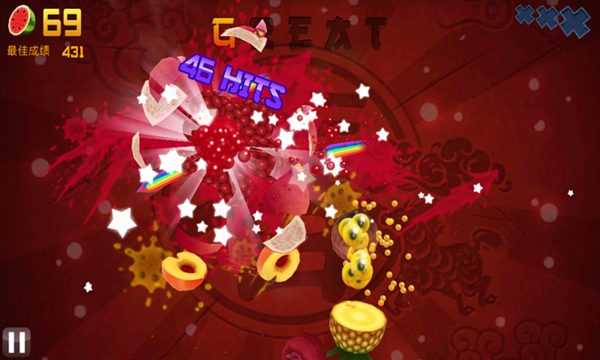 1.声效是一个游戏的精髓所在,玩的时候一定要开声音,出水果和出炸弹的声音是不一样的,每三次连续combo之后水果会加速,此时会有鼓点声,鼓点越弱了你就越需要连击,最终目标就是blitz +30。