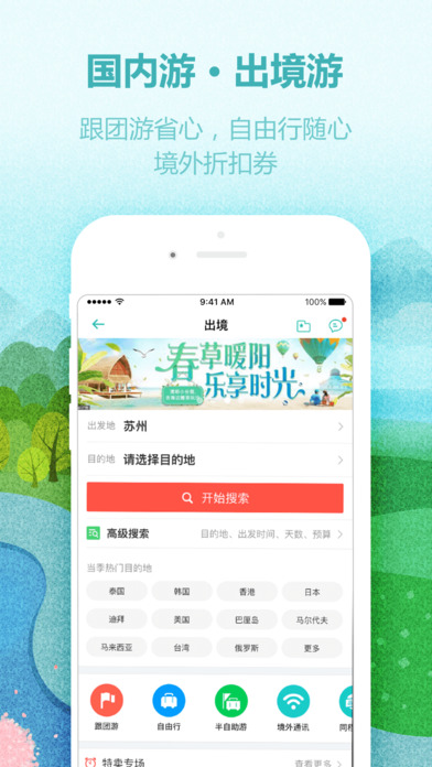 3. 出境游:全球热门目的地旅游团预订、半自助游预订;跟团自助随便怎么玩。