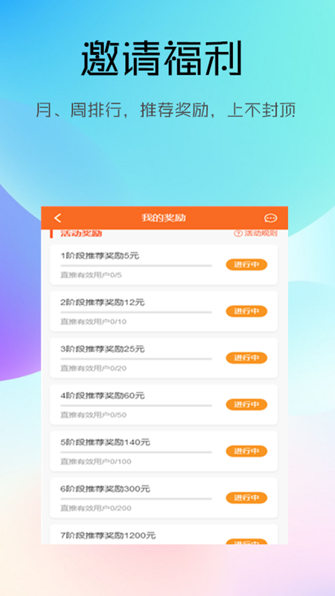 2、邀请福利,周排行,推荐奖励,上不封顶,活动多,阅读、悬赏、调查、游戏玩不尽。