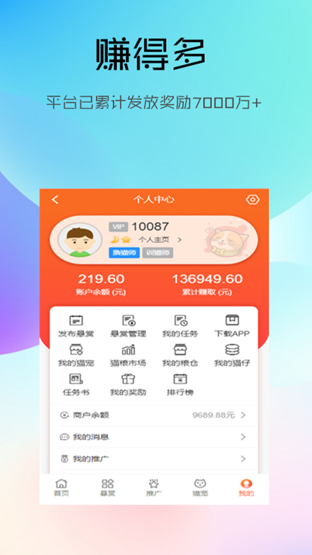 4、悬赏任务、浏览赚钱、游戏试玩、每日打卡、邀请好友、猫友圈、优惠商品、福利红包、活动室。